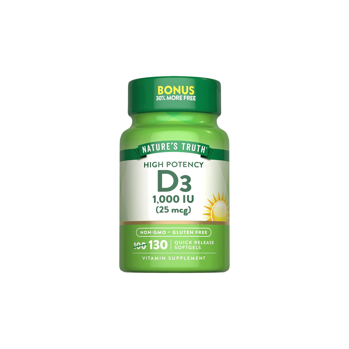 ویتامین D3 نیچر تروث ۱۳۰ عددی، در هر وعده ۲۵ میکروگرم یا ۱۰۰۰ واحد بینالمللی ویتامین D به عنوان D3 کوله کلسیفرول را ارائه میدهد. ویتامین D3 ما فاقد رنگ مصنوعی، طعم دهنده مصنوعی، شیرین کننده مصنوعی و مواد نگهدارنده است. این سافت ژلهای راحت، افزودنی آسان و در دسترس برای هر برنامه غذایی هستند!